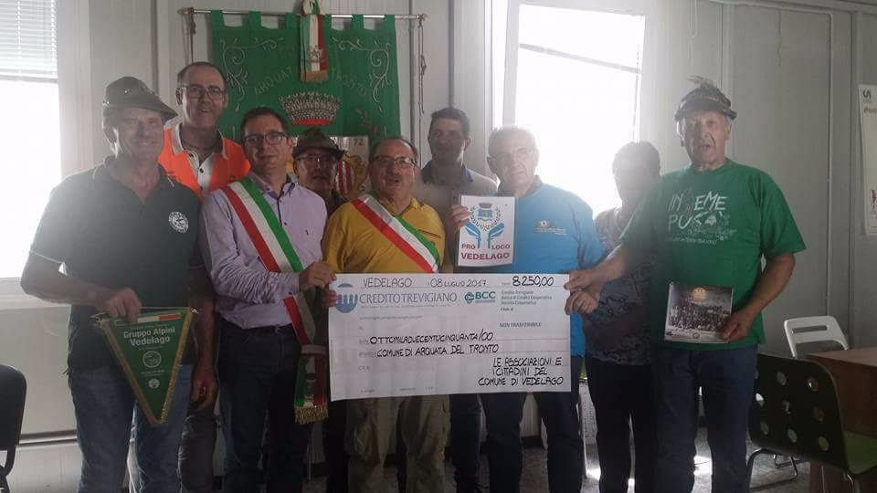 Nel corso della Giornata della Solidarietà “Amatriciamoci un pranzo solidale” tenuto lo scorso ottobre presso il Borgo rustico di Villa Emo, era stata raccolta la somma di € 8.250,00. La delegazione di Vedelago ha consegnato la somma al Sindaco di Arquata del Tronto Aleandro Petrucci, per la realizzazione del nuovo Centro Polifunzionale di Arquata.